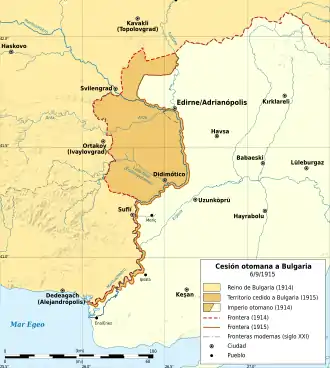 Los británicos emprendieron la ofensiva contra Galípoli el 6 de agosto de 1915, que evidenció la grave escasez de municiones del Imperio otomano. El 17 de agosto, el ministro de guerra turco, Enver Bajá, escribió al jefe del Estado Mayor alemán, Erich von Falkenhayn, para consultarle si se avecinaba una ofensiva austro-alemana contra Serbia. Cuando se le comunicó que esta dependía de la participación de Bulgaria, que a su vez estaba condicionada a la firma de un pacto otomano-búlgaro, los otomanos se apresuraron a pactar con Bulgaria el 22 de agosto. [2] Cedieron el río Maritsa y una franja de kilómetro y medio de anchura de la orilla izquierda del río.[3] Merced a ello, Bulgaria obtuvo el ferrocarril al puerto egeo de Dedeagach.[4] El cambio también hizo a Edirne (Adrianópolis) vulnerable a un eventual ataque búlgaro, pero la firma del acuerdo dependía de la firma de una convención militar entre Bulgaria, Austria-Hungría y Alemania.[2]