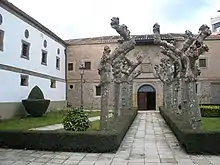 Destaca la portada del siglo XVII del pabellón NE.: puerta en arco de medio punto con cerco recto, bajo imposta que resuelve el cambio de material, de mampostería en el piso bajo a ladrillo visto en el alto. Sobre la puerta, se decora el paño superior encuadrando entre dos pilastras laterales - ligeramente resaltadas con motivos en esferas, pináculos y estrías - y el arco rebajado superior, un gran escudo bordeado de una molduración con motivos barrocos, volutas, dentículos, cordones, etc. muy libres y algo torpes e ingenuos, pero graciosos y efectivos. Al extremo de esta fachada, en el refuerzo de sillería, se ubica un escudo en ángulo.