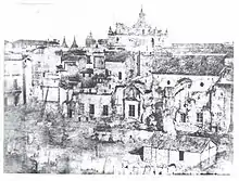 ![]() Grabado realizado por Pedro Tortorello en 1738 que muestra la casa consistorial hispalense desde la plaza San Francisco. Al fondo se observa un remonte que pertenece a la casa grande de San Francisco, sita en la actual plaza Nueva y aneja al consistorio. Por el arco situado en la parte izquierda del grabado se accedía a un atrio del convento | ||