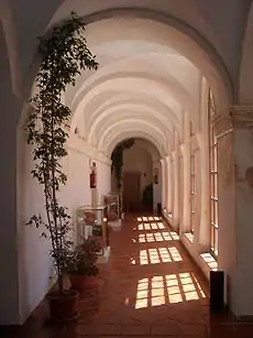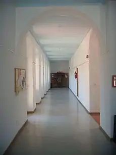 Respecto al interior, hay que destacar las transformaciones que ha sufrido el edificio desde su construcción en 1912. De la configuración original solo se conserva su planta, que se desarrolla alrededor del claustro central, el cual presenta planta cuadrada y aljibe en el centro del espacio abierto, delimitado por cuatro pandas de cinco tramos cubiertas con bóvedas de arista. Cada panda se abre al espacio central por medio de cinco arcos de medio punto, actualmente cerrados por medio de unas carpinterías modernas.[4]