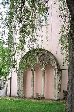 El claustro, construido a mediados del siglo XVI, era gótico, mientras que el pórtico se erigió en el XVII, de estilo grecorromano y de proporciones correctas, aunque no soportó bien el paso del tiempo.[2]