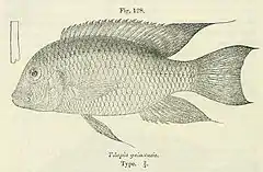 - Esta obra contiene una traducción derivada de «Tilapia guineensis» de Wikipedia en catalán, publicada por sus editores bajo la Licencia de documentación libre de GNU y la Licencia Creative Commons Atribución-CompartirIgual 3.0 Unported.