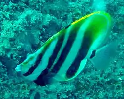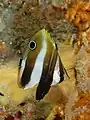 Los juveniles, en el extremo superior de la parte trasera de la aleta dorsal, tienen un gran punto negro, rodeado con un anillo blanco, a modo de ocelo, lo que, unido a la banda que les tapa el ojo, es un recurso muy utilizado en la familia para despistar a sus predadores.