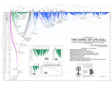 La figura de la derecha es un primer intento de mostrar un diagrama[10] que muestre todas estas características juntas. El coral de la vida está incrustado en un espacio bidimensional con el tiempo geológico como eje vertical y la diversidad de especies como horizontal. Los tiempos de divergencia, las relaciones de los grupos hermanos y los valores de riqueza de especies se derivaron de diversas fuentes. Las formas de las ramas se dibujan para indicar una diversificación gradual y las extinciones se muestran siempre que haya información disponible sobre valores de riqueza pasados. Los grupos grandes se muestran en diferentes colores. Se anotan los principales acontecimientos de la historia de la vida. La autosimilitud se demuestra al hacer zum en las monocotiledóneas, luego en las orquídeas, los cipripedoides y el género Cypripedium, mediante el cual el coral se transforma en una red (debido a la hibridación común entre las orquídeas). A primera vista, es similar a los romerogramas de uso frecuente en paleontología, pero hay una diferencia notable que requiere una discusión más detallada de la clasificación histórica de la vida.