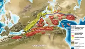 La Cordillera Central de Pangea se formó durante la colisión de Laurasia y el norte de Gondwana como parte de las orogenias Varisca y Apalache, que comenzaron durante el Carbonífero hace aproximadamente 340 millones de años, y se completaron al comienzo del Pérmico hace alrededor de 295 millones de años, cuando el rango estaba en su máxima elevación. Durante el Pérmico, la cordillera estuvo sujeta a una intensa meteorización física y mecánica, reduciendo los picos a aproximadamente la mitad de su tamaño original, creando numerosos valles intermontanos profundos. Para el Triásico medio, la cordillera se había reducido sustancialmente en tamaño, para el Jurásico más temprano, hace unos 200 millones de años, la cordillera en Europa occidental se había reducido a unas pocas áreas de tierras altas rodeadas de cuencas marinas profundas.[2]