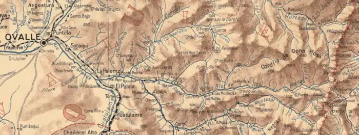 La cordillera de Doña Rosa al este de la ciudad de Ovalle, en el mapa de Chile de 1910, página 16 de Luis Risopatrón.