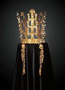 El origen de estos ornamentos tan elaborados muestra conexiones muy probables entre pueblos tan distantes como los pueblos escitas de Asia Central o de los bactrianos de la región de Afganistán. Se han hallado coronas del siglo I d.C muy similares en Afganistán y al norte del Mar Caspio. También se han encontrado motivos ornamentales muy similares de entre los siglos III y V en regiones como Liaoning y Mongolia Interior en China.