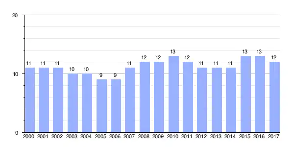 Gráfica de evolución demográfica de Corral de las Arrimadas[2] entre 2000 y 2017 |