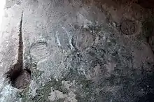 En la zona cubierta del corral situado en posición noroccidental del grupo inferior de construcciones hay labrados en la roca del piso una serie de siete orificios circulares dispuestos horizontalmente -a modo de cazoletas de escasa profundidad y sin conexión entre ella-: las de los extremos son más profundas y muestran signos de haber sido labradas con objetos metálicos, con la particularidad de que la situada próxima a la entrada posee una profunda ranura lineal en su parte inferior.