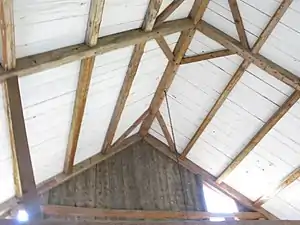 Vista de un techo con armazón de madera, donde se aprecian las correas. Esta vista es desde el interior del edificio, debajo del techo. Las "vigas" son las piezas de madera en ángulo hacia arriba desde el suelo. Confluyen en la parte superior del hastial en una "viga central", que tiene un refuerzo adicional para fijarlo a las propias vigas. Las "correas" son los grandes listones perpendiculares a las vigas. En esta imagen, se aprecian tres correas a cada lado del techo. Los paneles de revestimiento están pintados de blanco.