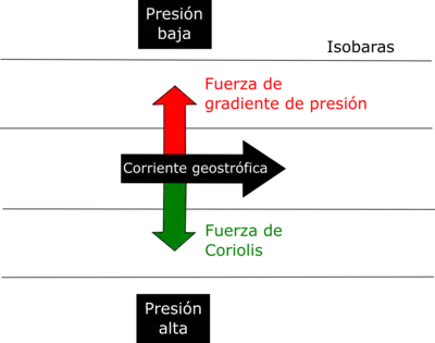 El agua de mar tiende naturalmente a moverse de una región de alta presión (o nivel del mar alto) a una región de baja presión (o nivel del mar bajo). La fuerza que empuja el agua hacia la región de baja presión se llama fuerza de gradiente de presión. En un flujo geostrófico, en lugar de que el agua se mueva de una región de alta presión (o nivel del mar alto) a una región de baja presión (o nivel del mar bajo), se mueve a lo largo de las líneas de presión igual (isobaras). Esto ocurre porque la Tierra está girando. La rotación de la tierra da como resultado una "fuerza" que se siente cuando el agua se mueve de lo alto a lo bajo, conocida como fuerza de Coriolis. La fuerza de Coriolis actúa en ángulos rectos al flujo, y cuando equilibra la fuerza del gradiente de presión, el flujo resultante se conoce como geostrófico.