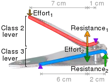 El mecanismo de un cortaúñas consiste en una combinación de dos palancas que permiten realizar una potente presión de corte sin apenas esfuerzo. El mango es una palanca de segundo orden que presiona las dos hojas de corte hasta unirlas. Las hojas actúan con gran fuerza, y dan lugar a una combinación de palanca de tercer orden. Los filos de las hojas realizan un movimiento corto para vencer la resistencia que ofrece la uña.