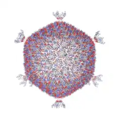 Albergan dicha información genética en una cápside carente de envoltura viral y estructuralmente definida por una simetría compleja, con aspecto esférico o subesférico y rica en lípidos.[3] La cápside icosaedra tiene un diámetro de 60 nm y presenta una membrana lipídica interna situada entre las cubiertas de proteínas exterior e interior.[4] Las cubiertas se componen de tres capas, con superficies que revelan un patrón con características distintivas,[5] incluyendo protuberancias de tipo espiga en los doce vértices.[6]