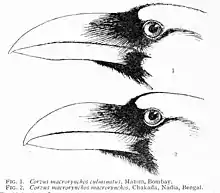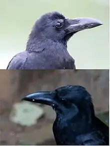 La cola del cuervo picudo que habitan en el Himalaya (subespecies intermedius y tibetosinensis ) tienen la cola ligeramente en forma de cuña, a diferencia de la redondeada del cuervo picudo indio. Los graznidos de cuervo picudo de la india son más ásperos que los del cuervo indio. En Sri Lanka, los cuervos indios carecen de la coloración gris en el cuello característica, pero son más deldados que los cuervos picudos indios.