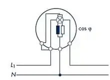 Este instrumento tiene en su interior una bobina de tensión y una de corriente dispuestas de tal forma que si no existe desfase, entre la corriente y la tensión producto de cargas inductivas o capacitivas, la aguja está en uno (al centro de la escala).