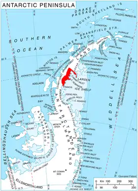 Los Antartandes separan a la costa Foyn de las costas ubicadas del lado occidental de la península Antártica: la costa Graham y la costa Loubet. La barrera de hielo Larsen se extiende desde la costa Foyn sobre el mar de Weddell. Destacan en la costa el cabo Robinson y la ensenada Cabinet.