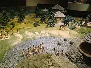 Reconstrucción que representa una ciudad precolombina costarricense, correspondiente a la cultura del Díquis, en el Pacífico sur de Costa Rica. Nótese las esferas de piedra, que en la actualidad son símbolos de identidad nacional. Museo del Oro Precolombino, San José de Costa Rica.