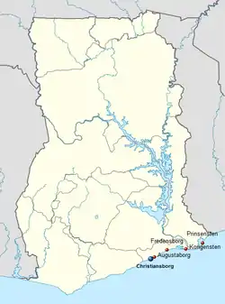 ![]() Localización de los principales enclaves de la Costa de Oro danesa. | |||||||||||||||||||||||||||||||||