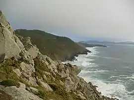 El frente costero acantilado, con alturas que van hasta los 150 metros, se forma en la ladera oeste del monte O facho de Donón que alcanza los 159 metros de altitud, en cuya cima se ubica la construcción conocida como "o Facho" (en castellano "la antorcha") un punto de vigilancia costera construido en el siglo XVI y llega incluso a "robarle" el nombre al monte. Desde este punto se puede observar un tramo costero que va desde Cabo Silleiro a Cabo Fisterra. El lugar, donde de producen unas impresionante puestas de sol, ha sido ocupado a lo largo del tiempo por diferentes asentamientos humanos, algunos con finalidades religiosas (se ha hallado una de las mayores concentraciones de aras romanas de la península ibérica). La actitud media es de 48 metros sobre el nivel del mar.