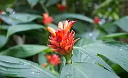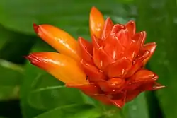 Las brácteas brillantes y superpuestas forman una inflorescencia terminal, que tiene forma de pico a ovoide. Las brácteas son de color rojo a naranja, usualmente se vuelven más anaranjadas en el ápice, que se curva hacia afuera. La inflorescencia es bastante variable en tamaño, que va de 4 a 18 centímetros de largo y de 3 a 9 centímetros de ancho. Durante la floración, florecillas tubulares pequeñas, hermafroditas amarillas o anaranjadas emergen entre las brácteas. Por lo general, son tan largas como las brácteas, pero pueden ser sustancialmente más largas.[4] [5] La altura de la planta en general oscila entre 1 y 1,5 metros, aunque ocasionalmente puede crecer hasta 3 metros. Sus rizomas tienen aproximadamente 20 milímetros de espesor. A diferencia de Zingiber officinale, los rizomas no son comestibles, y no se usa como especia.