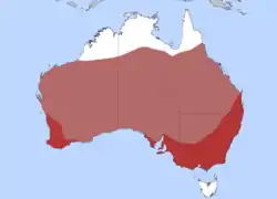 ![]() Distribución de la codorniz pectoral Rojo oscuro = común Rojo claro = nómada | ||