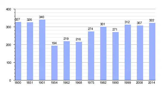 Los datos demográficos contemplados en este gráfico de la comuna de Coulanges[4] se han cogido de 1800 a 1999 de la página francesa EHESS/Cassini, y los demás datos de la página del INSEE.[5]
