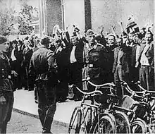 Además, antes de la invasión de Polonia, los nazis prepararon una lista detallada que identificaba a más de 61 000 objetivos polacos (en su mayoría civiles) por su nombre, con ayuda de la minoría alemana que vivía en el territorio de la Segunda República Polaca.[20] La lista se imprimió en secreto como en un legajo de 192 páginas llamado Sonderfahndungsbuch Polen (Libro de acusación especial - Polonia), y se compuso únicamente de nombres y fechas de nacimiento. Incluía políticos, académicos, actores, intelectuales, médicos, abogados, nobles, sacerdotes, funcionarios públicos y muchos otros, quienes quedaron a merced de los escuadrones de la muerte paramilitares de las SS ayudados por los verdugos de la Volksdeutscher Selbstschutz.[21] Los primeros Einsatzgruppen de la Segunda Guerra Mundial fueron formados por las SS en el curso de la invasión.[21] Fueron desplegados detrás de las líneas del frente para ejecutar a grupos de personas consideradas, en virtud de su estatus social, capaces de incitar a los esfuerzos de resistencia contra los alemanes.[22][23] La mentira más utilizada para justificar asesinatos indiscriminados por parte de los escuadrones de acción móvil fue siempre la misma: la afirmación inventada de un supuesto ataque a las fuerzas alemanas. [24]