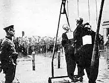 Los polacos étnicos en Polonia fueron el objetivo de la política łapanka que las fuerzas alemanas utilizaron para arrestar indiscriminadamente a los civiles en las calles. En Varsovia, entre 1942 y 1944, hubo aproximadamente 400 víctimas diarias de łapanka . Se estima que decenas de miles de estas víctimas murieron en ejecuciones masivas, incluidas unas 37 000 personas en el complejo penitenciario de Pawiak, dirigido por la Gestapo, y miles más muertos en las ruinas del gueto de Varsovia.[130]