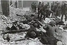 Durante la represión del Levantamiento de 1944 en Varsovia, las fuerzas alemanas cometieron muchas atrocidades contra los civiles polacos, siguiendo la orden de Hitler de arrasar la ciudad. El hecho más notorio fue la Masacre de Wola, donde a principios de agosto de 1944, entre 40 000 y 50 000 civiles (hombres, mujeres y niños) fueron metódicamente detenidos y ejecutados por el Einsatzkommando de la Sicherheitspolizei bajo el mando de Heinz Reinefarth y los criminales alemanes amnistiados de la Dirlewanger. Otras masacres similares tuvieron lugar en las áreas de los distritos de Śródmieście (centro de la ciudad), Stare Miasto (casco antiguo) y Marymont . En Ochota, colaboradores rusos de RONA llevaron a cabo la Masacre de Ochota, con asesinatos de civiles, violaciones y saqueos . Después de la caída de Stare Miasto, a principios de septiembre, 7000 pacientes hospitalarios gravemente heridos fueron ejecutados o quemados vivos, a menudo junto con el personal médico a cargo de ellos. Más tarde se cometieron atrocidades similares en el distrito de Czerniaków y después de la caída de los distritos de Powiśle y Mokotów.[152][153]