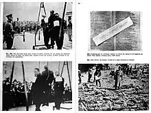 En los primeros tres meses de la guerra, desde el otoño de 1939 hasta la primavera de 1940, unos 60 000 exfuncionarios gubernamentales, oficiales militares de la reserva, propietarios de tierras, clérigos y miembros de la intelectualidad polaca fueron ejecutados región por región en el llamado Intelligenzaktion,[38] incluidos más de 1000 prisioneros de guerra.[39][40][41][42] Todas las fuerzas alemanas sin excepción, incluidas la Wehrmacht, la Gestapo, las SS y la Selbstschutz, llevaron a cabo ejecuciones sumarias de polacos en violación de los acuerdos internacionales. [43] Los asesinatos en masa fueron parte de la operación secreta Tannenberg, una de las primeras medidas de la colonización de colonos Generalplan Ost . Tanto los cristianos polacos como los judíos fueron asesinados y enterrados en fosas comunes excavadas apresuradamente o enviados a prisiones y campos de concentración alemanes. "Todo lo que encontremos en forma de clase alta en Polonia será liquidado", [44] había ordenado Hitler. [45] En la Intelligenzaktion Pommern, una acción regional en el voivodato de Pomerania murieron 23 000 polacos. [46] Fue continuado por la operación alemana AB-Aktion en Polonia a mediados de la década de 1940. [47] La AB-Aktion vio la masacre de profesores de Lwów y la ejecución de unos 1.700 polacos en el bosque de Palmiry . Varios miles de víctimas civiles fueron ejecutadas o encarceladas. Los Einsatzgruppen también fueron responsables de la matanza indiscriminada de judíos y polacos durante la invasión alemana de la Unión Soviética de 1941. [48]
