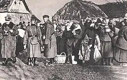 El mejor ejemplo de resistencia polaca, no dirigida a herir a los alemanes o lograr objetivos políticos, sino a proteger a los polacos, fue el Levantamiento de Zamość . Fue una situación poco común en la que el Ejército Nacional políticamente anticomunista,[87] los Batallones de Campesinos políticamente neutrales, la Guardia Popular comunista y los partisanos soviéticos, trabajaron juntos para proteger a los polacos de los abusos alemanes, principalmente la expulsión forzada y los asesinatos en masa llevados a cabo por el Ejército Insurgente Ucraniano contra el pueblo polaco. El Levantamiento frenó en gran medida la expulsión alemana de polacos y la colonización del área con alemanes. Los alemanes llegaron incluso a crear una zona de amortiguación de pueblos habitados por ucranianos étnicos amigos de los alemanes. Los campesinos polacos se mostraron reacios a unirse a la resistencia armada, pero se vieron obligados a protegerse.