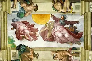 Este mural es el primero que ocupa un espacio grande por lo que carece de ignudis y medallones que lo flanqueen. En ella aparece Dios en dos posiciones distintas. La primera que llama nuestra atención es la de la derecha. En ella, Dios aparece con el ceño fruncido y un porte imponente, tocando con cada mano los dos astros: el Sol y la Luna.