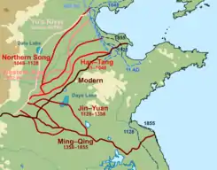 ![]() El curso del río Amarillo en ese momento (marcado como Han-Tang) comenzó a ser alterado por las inundaciones del río en 1034 | ||