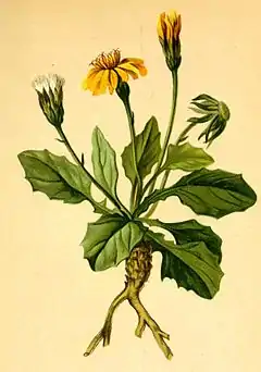 Planta vivaz, más o menos tomentosa, que no llega a sobrepasar los 20 o 30 cm de altura. Hojas en roseta deslavazada, de hasta 11 x 3 cm, ovales o pinnadolobuladas, con el lóbulo final mayor, oval o redondeado, 1, 2-4 laterales. Pecíolo alado. Flores amarillas en capítulos situados al extremo de un tallo áfilo. Lígulas externas a menudo por su cara exterior. Brácteas externas menores que las internas, pubescentes o tomentosas.[2]