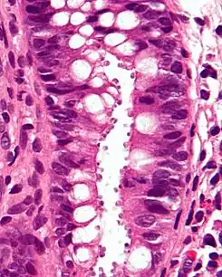![]() Micrografía que muestra la criptosporidiosis. El Cryptosporidium son los cuerpos pequeños y redondos en la superficie del epitelio. Tinción H&E. Biopsia de colon. | ||