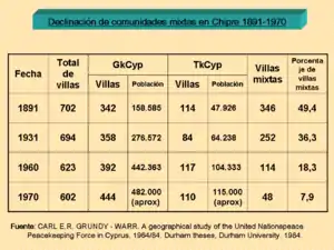 UNFICYP carried out a detailed survey of all damage to properties throughout the island during the disturbances; it shows that in 109 villages, most of them Turkish-Cypriot or mixed villages, 527 houses have been destroyed while 2,000 others have suffered damage from looting.La Fuerza de las Naciones Unidades para el Mantenimiento de la Paz en Chipre llevó a cabo una inspección detallada de todos los daños a las propiedades a lo largo de la isla durante los disturbios; muestra que, en 109 pueblos, la mayoría de ellos pueblos turcochipriotas o mixtos, fueron destruidas 527 casas, mientras que otras 2000 han sufrido daños por saqueos.