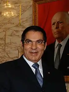 La revolución tunecina comenzó con la autoinmolación de Mohamed Bouazizi el 17 de diciembre de 2010, aunque también es posible considerar que el ataque de los mineros en la ciudad de Gafsa, en el centro oeste, en 2008 fue el comienzo oficial del movimiento.[58] El pueblo tunecino derrocó a Ben Ali, que había impuesto un estado policial. La revolución, como otras revoluciones de la Primavera Árabe que seguirían pronto, fue provocada por la pobreza endémica, el aumento de los precios de los alimentos y el desempleo crónico.[58] Los tunecinos exigieron democracia, derechos humanos, el fin de la corrupción y el fin de la aplicación de la Ley Antiterrorista de 2003, que de hecho criminalizó sus ideas y prácticas religiosas.[59]