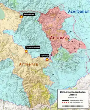El 16 de noviembre de 2021, se produjeron enfrentamientos entre Azerbaiyán y Armenia en las regiones de Syunik-Gegharkunik/Kalbajar-Lachin. Siete soldados azerbaiyanos y seis armenios murieron,[36] mientras que 32 soldados armenios fueron capturados.[37] Según el comandante militar y político armenio Samvel Babayan, Azerbaiyán fue intentando alcanzar dos objetivos: establecer el un corredor a la Nakhchivan e imponer un tratado de paz mediante el reconocimiento de la integridad territorial.[38] The clashes ended at 18:30 local time after a Russian-mediated ceasefire.[39] El 16 de noviembre, Pashinyan dijo que las fuerzas azerbaiyanas ocuparon aproximadamente 41 kilómetros cuadrados (15,8 mi²) de Armenia. La cifra de 41 kilómetros cuadrados se ha utilizado desde mayo, lo que sugeriría que no se ocupó ninguna nueva tierra en esta nueva ronda de combates, pero esto contradecía el informe del MOD armenio, según el cual Armenia perdió dos posiciones militares el 16 de noviembre.