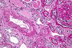 ![]() Micrografía mostrando microangiopatía trombótica, una hallazgo histopatológico presente en las crisis hipertensivas. Biopsia de riñón teñida con ácido peryódico de Schiff | ||