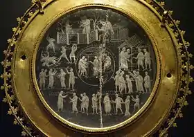 El elemento original de la obra es un disco circular de cuarzo claro ("cristal de roca"), que mide 11,5 centímetros de diámetro. Está grabado en entalladura con ocho escenas representando la historia de Susana y los viejos, relatada en el libro de Daniel (pero considerada una parte de los apócrifos por los protestantes).[2] Susana aparece primero falsamente acusada y condenada por adulterio por los viejos. Daniel interviene para preguntar a los viejos, descubre su falso testimonio y consigue su ejecución por lapidación. En la escena final, Susana es declarada inocente. Las escenas están acompañadas por breves inscripciones en latín extraídas de la Vulgata.[1][3]