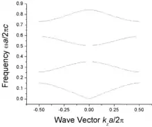 donde es la velocidad de la luz. Escrita así solo hace falta mirar líneas más arriba para comprobar su similitud con la ecuación (1). Los dos primeros términos funcionan como análogo a la energía cinética, el tercero, en el que aparece la dependencia espacial del dieléctrico es similar a un potencial periódico en la ecuación de Schrödinger, y la parte del índice de refracción constante representa las energías de los modos de propagación.