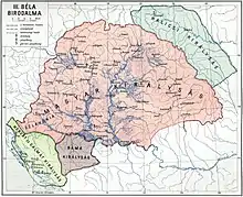 Durante el gobierno de Béla IV, los mongoles (o tártaros ), habiendo conquistado Kiev y el sur de Rusia, invadieron Hungría en 1241. En la batalla de Mohi en el río Sajó el 11 de abril de 1241, los mongoles aniquilaron al ejército húngaro.[An. 7] Coloman, hermano del rey Béla, resultó gravemente herido y fue trasladado al sur de Croacia, donde murió a causa de sus heridas. Batu Khan envió a su primo Kadan con un ejército de 10,000-20,000 hombres para perseguir al rey Béla, quien huyó a Croacia.[49]
