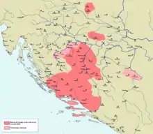 Después de la conquista del Imperio bizantino en 1453, los otomanos se expandieron rápidamente hacia el oeste y también amenazaron al Reino de Croacia,[58] que se convirtió en campo de batalla entre las fuerzas húngaras y turcas. Bajo Giovanni da Capistrano el bando cristiano obtuvo una victoria en el sitio de Belgrado de 1456. Tras la caída del Reino de Bosnia en 1463, el rey Matias Corvino fortaleció el sistema de defensa al establecer el Banato de Jajce y el Banato de Srebrenik. Aunque los otomanos tuvieron problemas para romper las líneas de defensa, llevaron a cabo regularmente incursiones de saqueo en Croacia y en el sur de Hungría. Durante una de esas incursiones en 1463, el ban croata Pavao Špirančić fue capturado en Senj. [59] El Imperio otomano se expandió rápidamente a las áreas del sur, donde conquistaron gran parte de Herzegovina en 1482 y fortalezas croatas en el valle de Neretva.[60]