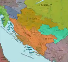 El reino de Croacia en latín, Regnum Croatiae; en croata, Kraljevina Hrvatska or Hrvatsko kraljevstvo, Hrvatska zemlja) entró en una unión personal con el Reino de Hungría en 1102—tras un período de tres siglos de independencia croata,[1] gobernado por duques y reyes de las dinastías Trpimirović y Svetoslavić— después de una crisis de sucesión al morir el rey Demetrius Zvonimir.[2][3] Con la coronación del rey Coloman de Hungría como «Rey de Croacia y Dalmacia» en 1102 en Biograd, el reino pasó a la dinastía de Árpád, de la que dependerá hasta 1301, cuando la línea (masculina) de la dinastía se extinguió.