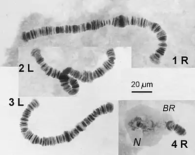 Este bandeo es reproducible de núcleo a núcleo, formando un patrón constante de tal manera que los cromosomas pueden ser identificados y mapeados en toda su longitud. El patrón de bandeo que presentan los cromosomas politénicos es un reflejo constante de las secuencias de ADN, y por tanto las bandas sirven como marcadores para localizar varias características genéticas.