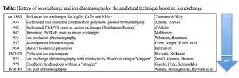 Los métodos iónicos se han utilizado desde 1850, cuando H. Thompson y J. T. Way, investigadores de Inglaterra, trataron diversas arcillas con sulfato de amonio o carbonato en solución para extraer el amoníaco y liberar calcio. En 1927 se utilizó la primera columna de zeolita mineral para eliminar iones de calcio y magnesio que interferían en la solución, para determinar el contenido de sulfato de agua. La versión moderna de la IEC se desarrolló durante la época de la guerra del Proyecto Manhattan. Se requería una técnica para separar y concentrar los elementos radiactivos necesarios para hacer la bomba atómica. Los investigadores eligieron absorbentes que pudieran cerrarse sobre elementos transuránidos cargados, y que pudieran eliminarse diferencialmente. Finalmente, una vez desclasificada en 1947, la Comisión de Energía Atómica dio a conocer la información sobre el uso de la cromatografía de intercambio iónico para la separación de productos de fisión nuclear. Estas técnicas pueden utilizar nuevas resinas IE para desarrollar los sistemas que se utilizan a menudo hoy en día para la purificación específica de productos biológicos y de sustancias inorgánicas.