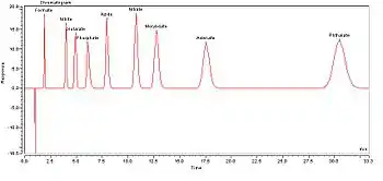 El cromatograma de iones que se muestra en esta sección corresponde a uno típico obtenido con una columna de intercambio aniónico.