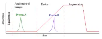 Las proteínas tienen numerosos grupos funcionales que tienen tanto cargas positivas como negativas. La cromatografía de intercambio iónico separa las proteínas de acuerdo con su carga neta, la cual depende de la composición de la fase móvil. Es posible separar varias moléculas de proteína ajustando el pH o la concentración de los iones de la fase móvil. Por ejemplo, si la proteína tiene una carga neta positiva con un pH de 7, entonces puede unirse a una columna cargada negativamente, mientras que una proteína con carga negativa no lo podría hacer. También podría eliminarse cambiando el pH para que la carga neta de la proteína fuera negativa.