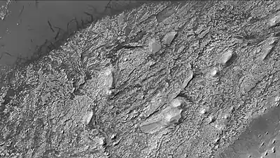 - Butte en el cráter Crommelin, visto por el HiRISE del programa HiWish. La ubicación es el cuadrángulo Oxia Palus.