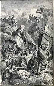 Escondiendo a sus hombres en la maleza de la montaña en un acantilado que surgió inmediatamente arriba y a la derecha de la ruta de marcha de Aníbal, a unos 100 pies más o menos por encima del camino, Aníbal colocó sus honderos y arqueros allí. Este saliente era un excelente lugar desde el cual atacar a un enemigo mientras marchaba en columna a través del paso.[88] El descenso desde este paso era empinado, y a los cartagineses les costaba marchar por este lado del paso,[88] especialmente a los animales de carga.[87] Los bárbaros, al ver esto, atacaron de todas formas, a pesar de su posición desventajosa. Más animales de equipaje se perdieron en la confusión del ataque bárbaro, y rodaron por los precipicios hasta su muerte.[88] Esto puso a Aníbal en una situación difícil. Sin embargo, Aníbal, a la cabeza del mismo cuerpo de élite al que llevó a tomar el saliente, los condujo contra estos bárbaros decididos. Virtualmente todos estos bárbaros murieron en el subsiguiente combate, ya que estaban luchando de espaldas a un escarpado precipicio, tratando de lanzar sus flechas y dardos cuesta arriba a los cartagineses que avanzaban. <Después de este concurso de armas, el equipaje se mantuvo en buen estado y el ejército cartaginés siguió el camino hacia la llanura que comienza más o menos en la moderna Bourget.[89]